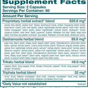 Each 500 mg tablet contains: Shatavari root (Asparagus racemosus)+, Guduchi (Indian Tinospora) stem (Tinospora cordifolia)+, Vidari Kanda (Indian Kudzu) root (Pueraria tuberosa)+, Punarnava (Boerhavia) root (Boerhavia diffusa)+, Musta (Cyperus) root (Cyperus rotundus)+, Gotu Kola aerials (Centella asiatica)+, Coriander seed (Coriandrum sativum)+, Fennel seed (Foeniculum vulgare)+, Cardamom seed (Elettaria cardamomum)+, Aloe Vera juice (Aloe barbadensis)+.