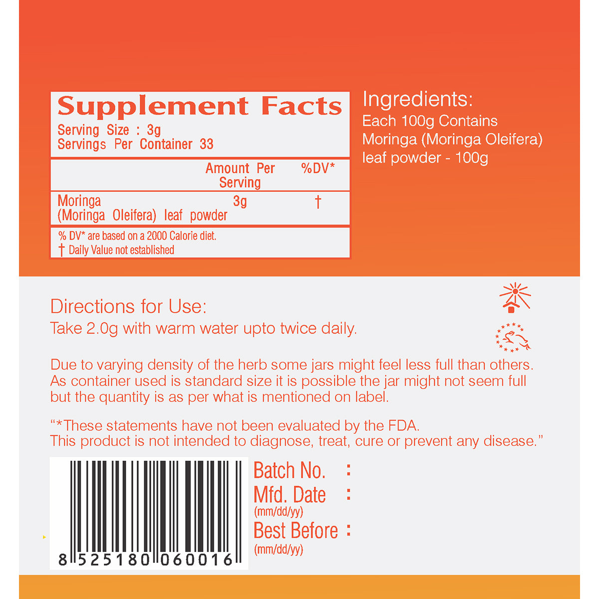 Moringa is known for its antioxidant, anti-inflammatory & nutrient dense properties. The nutritional benefits of moringa leaf support a number of bodily functions such as cardio vascular, digestion, metabolism, immune-modular and neurological functions. It is considered rich in vitamins, proteins, aminoacids, fiber, chlorophyll, minerals and much more!